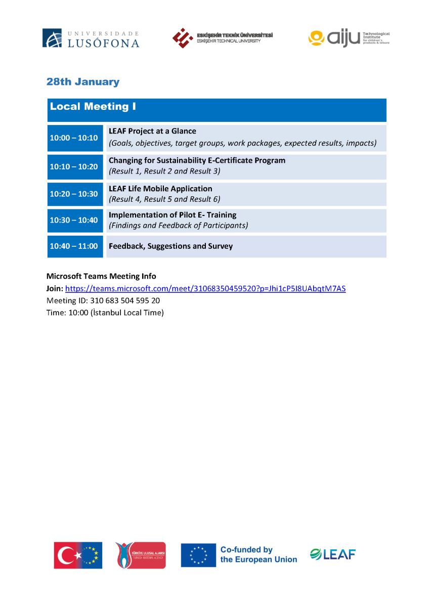 An online meeting (LM1: Local Meeting) will be held on the MS TEAMS platform on Wednesday, January 28, 2026, from 10:00 to 11:00. The purpose of this meeting is to share the developed project outputs with local stakeholders, demonstrate how stakeholder institutions can access and utilize these resources, and evaluate opportunities for future collaboration.